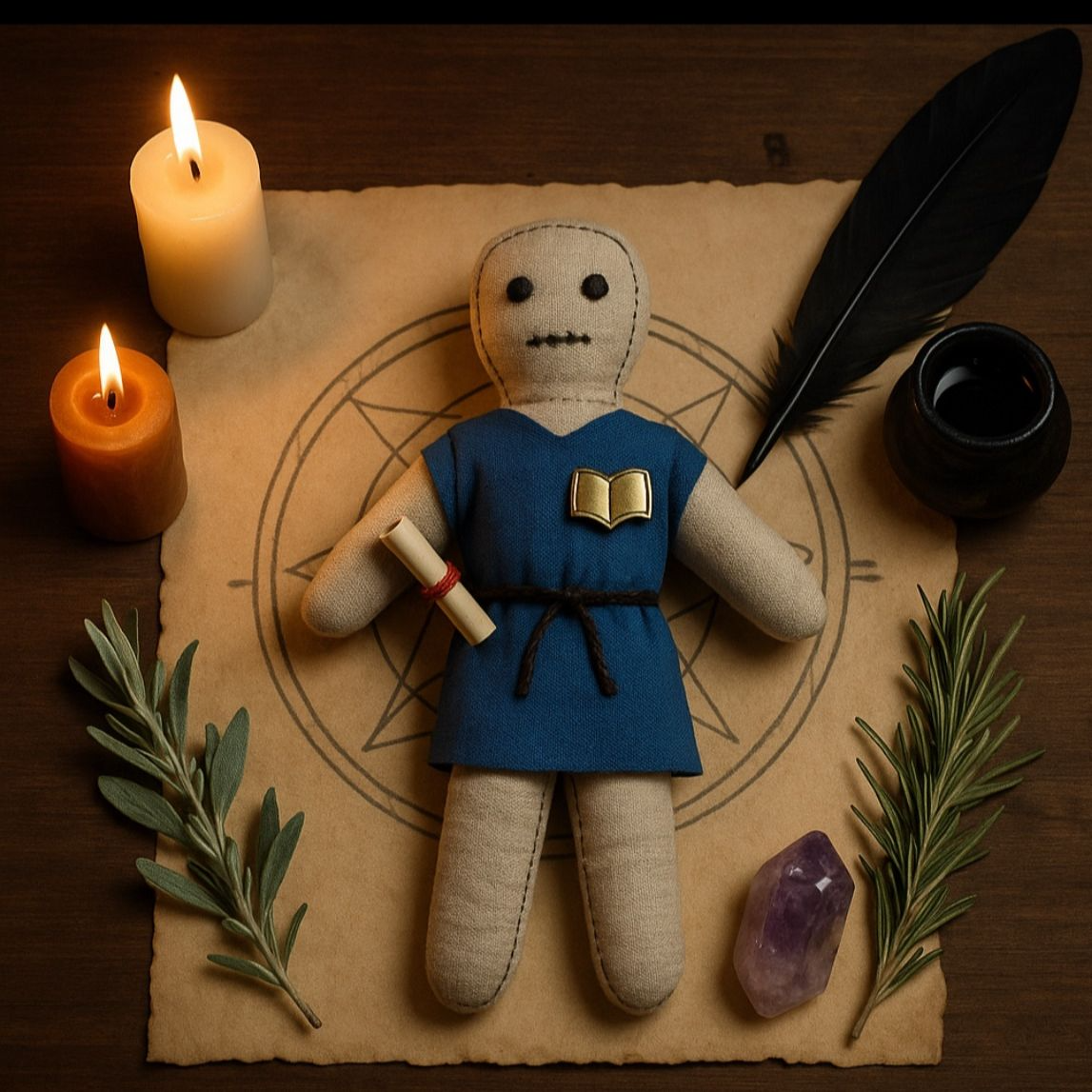 El muñeco actúa como un canal energético y protector, absorbiendo bloqueos, atrayendo claridad mental y activando las fuerzas invisibles del enfoque, la disciplina y la retención. Alrededor de él, se invocan runas de sabiduría, se encienden velas de concentración y se trazan símbolos que favorecen la excelencia académica.